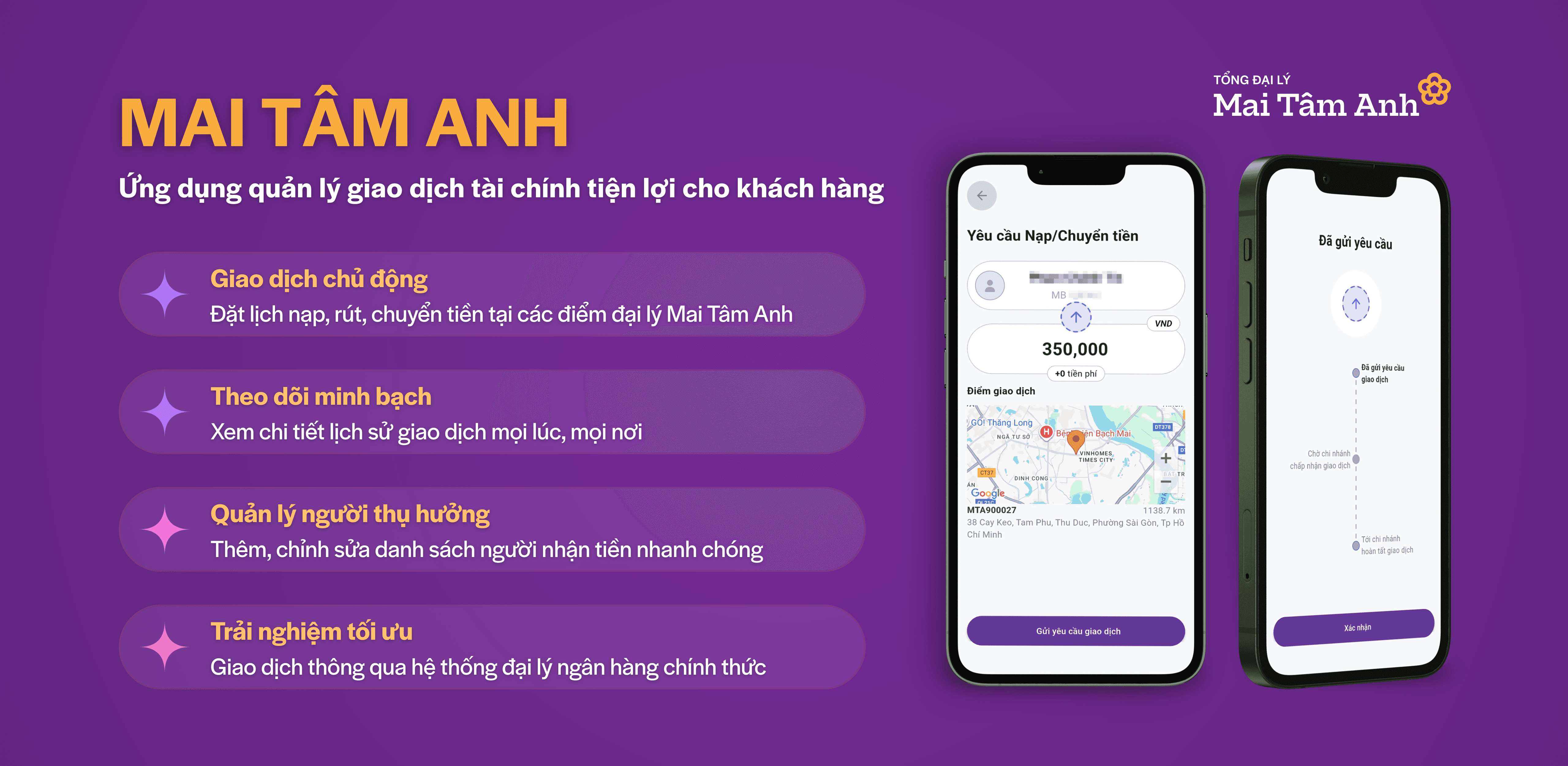 Giao dịch được thực hiện thông qua hệ thống đại lý ngân hàng chính thức của Mai Tâm Anh, đảm bảo quy trình rõ ràng và tuân thủ các tiêu chuẩn an toàn trong vận hành tài chính.